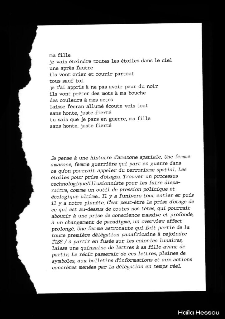 Son travail d’écriture consiste à invoquer nos imaginaires collectifs, pour les inviter à converser avec le présent. Avec Amazonies Spatiales, elle souhaite ouvrir les fenêtres pour se projeter loin, parce que la connaissance n’empêche pas l’émerveillement ou l’éloge du merveilleux, au contraire ! Elle rêve d’une nouvelle qui s’appuie sur l’afrofuturisme, ou plus précisément sur un futurisme africain, voire afropéen, avec comme socle, des figures historiques (Celle qu’on appelle reine des Amazones au Bénin, Tassi Hangbé), des croyances (géomancie, animisme, cosmologie vodoun). Un socle de syncrétisme pour une Afrique puissante inventée (qui s’invente déjà aujourd’hui : Agence spatiale africaine, satellite ghanéens). Elle écrit : “L’espace est parfois écran, parfois miroir. Utilisons le futur comme un outil ! Ni dystopie, ni utopie : inventer notre futur, avec exigence et précision, c’est prendre de l’avance sur notre temps !”