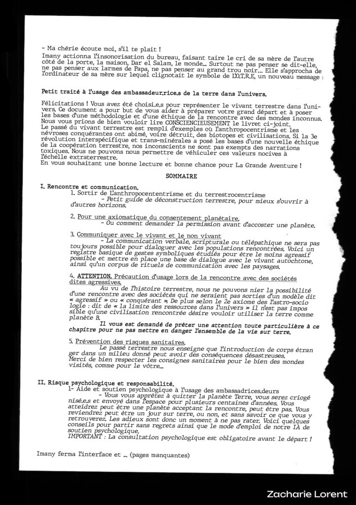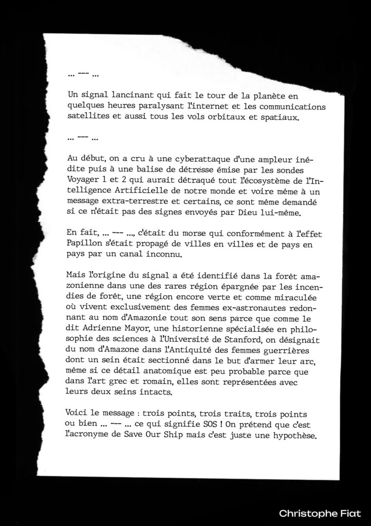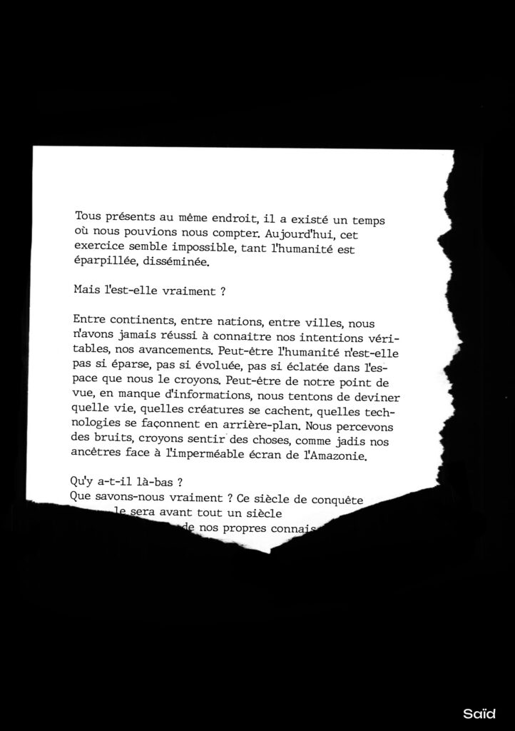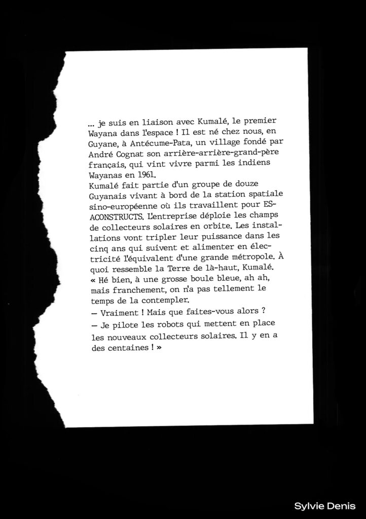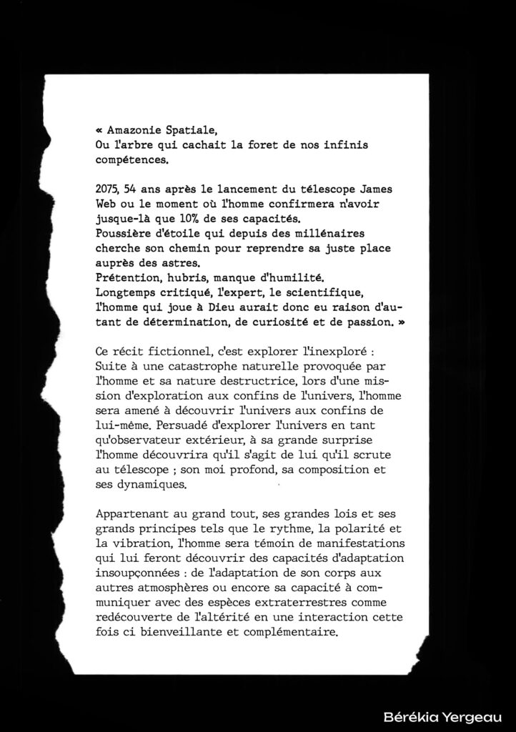 Il écrit : “Aujourd’hui, peu d’entre nous connaissent véritablement les détails de l’état d’avancement de l’exploration spatiale, d’où l’intérêt des futures discussions avec des experts. L’espace et le ciel étoilé restent des éléments de fascination plus que de connaissance, y compris pour moi-même. L’*Amazonie*, c’est aussi l’*inconnu*, un lieu lointain, réservoir d’images correspondant peu ou pas à la réalité. J’imagine les *Amazonies spatiales* refléter la (mé)connaissance répandue entre humains dans un demi-siècle, l’écart suspendu entre la réalité et ce qu’on en dira à ce moment. Y aurait-il un intérêt à réduire cet écart ? ou à le conserver ? Je vois le projet *Amazonies spatiales* comme un point de convergence entre différentes préoccupations qui jalonnent mon propre parcours.”