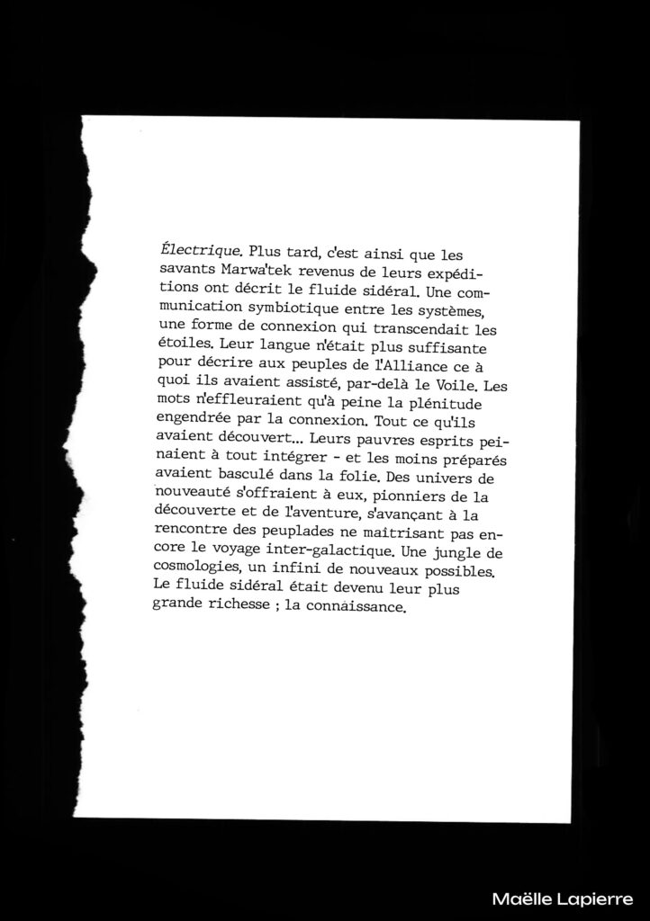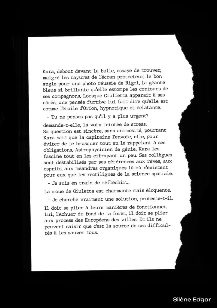 Sa passion se résume à l’alchimie par les mots, la poésie, la narration et le théâtre. Les rencontres et les différents procédés de créations l’inspirent et l’animent. L’imaginaire spatial au futur est une zone qui reste pour elle inexplorée. S’y projeter, c’est élargir le champ des possibles et ce tant dans le processus d’écriture que dans notre capacité humaine à créer ce futur. Étant l’épouse d’un ingénieur informatique travaillant au centre CSG de Kourou, elle vit depuis près d’une décennie ce maillage scientifique et artistique. Elle est à l’affût des dernières grandes réalisations spatiales telle que l’envoie de James Web en décembre 2021 et se plaît à réfléchir aux impacts et débouchés que ces avancées scientifiques nous auront apportés.