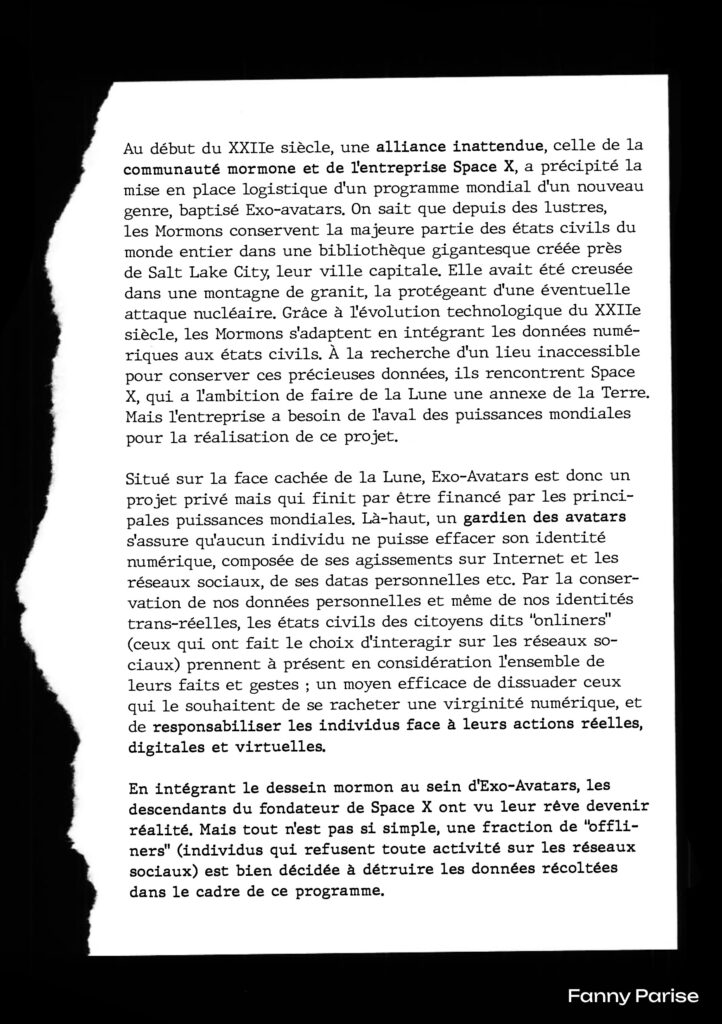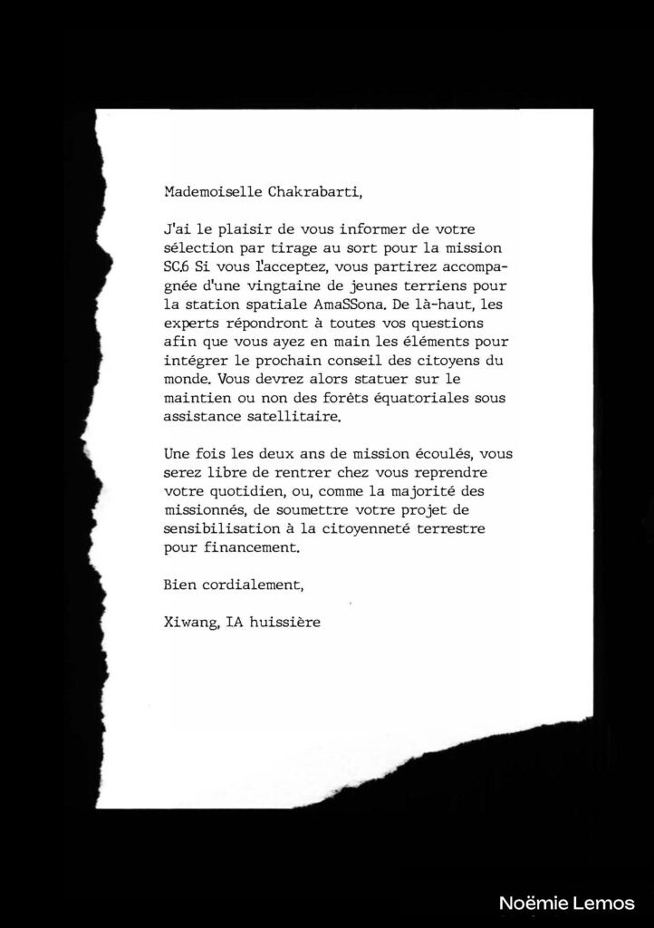 « Amazonies » ? Elle pense nature exubérante, exploration, mais aussi antagonismes : économie contre écologie, industriels contre autochtones et défenseurs de l’environnement. « Spatiales » ? Elle pense science, technique, vertige de l’infiniment grand, mais aussi aventure collective. Face à la crise climatique, elle est persuadée qu’il importe de reconnecter tous ces domaines plutôt que de laisser les fossés se creuser. Pour trouver un terrain d’entente entre nature et technique, ses premières réflexions la portent vers le droit, notamment la notion de personnalité juridique des écosystèmes, qui développe une vision intégrée, globale, de l’homme dans son environnement. Elle aimerait étendre cette réflexion au domaine spatial, à la façon dont l’homme s’intègre dans le système solaire. En 2075, elle veut croire que notre société prendra mieux en compte l’interdépendance unissant les êtres vivants sur notre planète. Mais que se passerait-il si nos explorateurs spatiaux découvraient un écosystème autre ? Aurions-nous la sagesse de nous mettre en retrait, de questionner le droit que nous avons sur un système qui ne nous inclut pas ? “Regarder vers l’espace, c’est prendre du recul sur nous-mêmes : un satellite dévoile des réalités d’ensemble invisibles au simple « terrien ». Peut-être trouverons-nous en scrutant les étoiles des clés pour mieux nous inscrire dans le monde où nous vivons. Je ne vois pas grand-chose de plus motivant que cette aspiration.” écrit-elle.