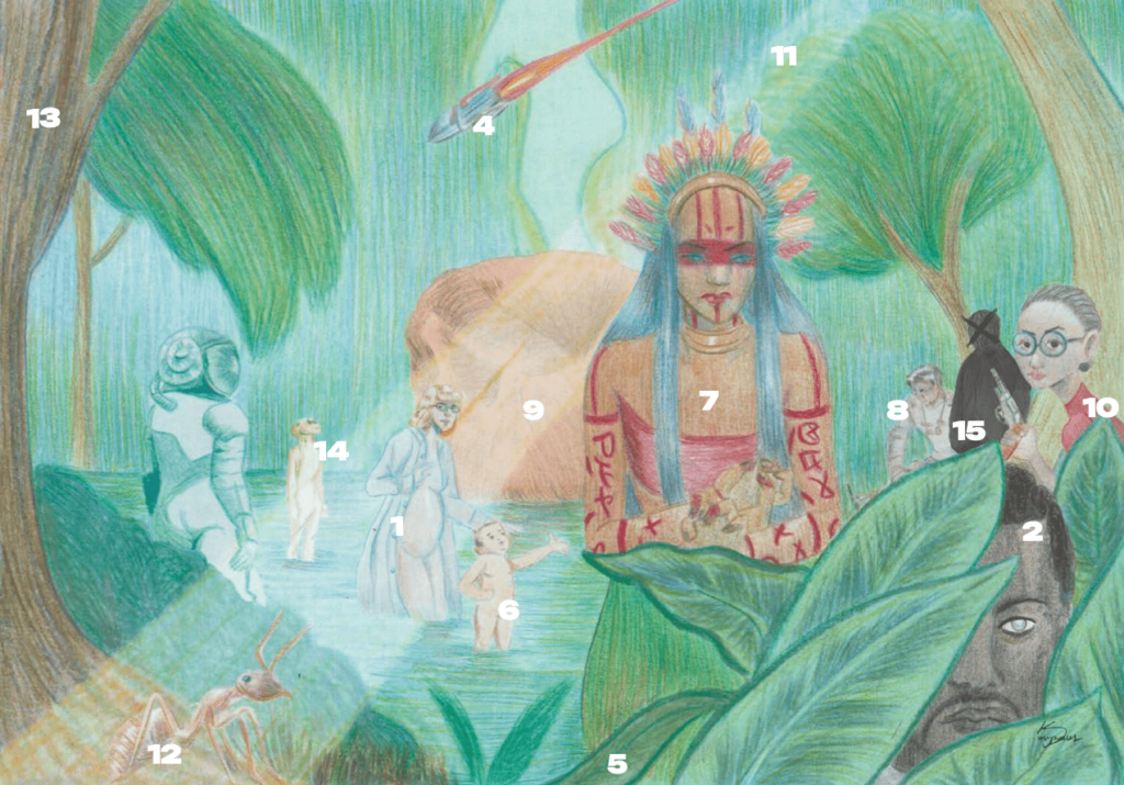 Remis à chaque auteur·rice dès le premier jour de la résidence, c’est à la fois le socle du projet et la pierre angulaire des récits à venir. Celui-ci introduit la figure centrale des Amazonies Spatiales, Vincente Yáñez Pinzón, ainsi que les motifs d’ancrage. Il s’agit de personnages, de décors ou d’éléments (sur)naturels qui devront apparaître dans les récits à horizon 2075.